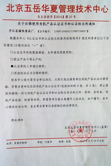 關(guān)于注銷開江縣滋味食品廠使用有機(jī)產(chǎn)品認(rèn)證證書和認(rèn)證標(biāo)志的通知