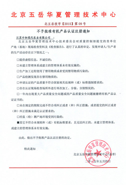 關(guān)于不予批準有機產(chǎn)品認證注冊的通知