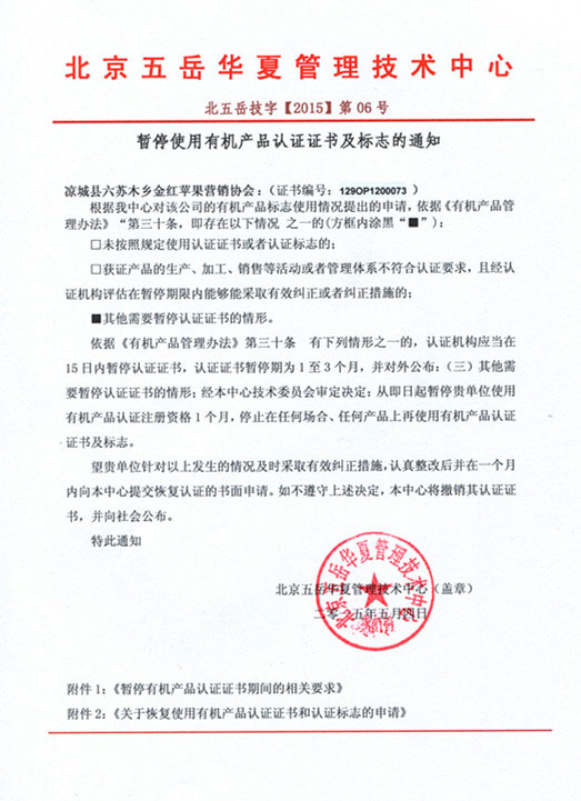 關(guān)于暫停使用有機(jī)產(chǎn)品認(rèn)證證書及標(biāo)志的通知