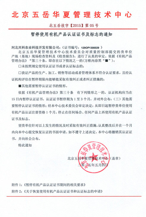 關(guān)于暫停使用有機產(chǎn)品認證證書及標志的通知