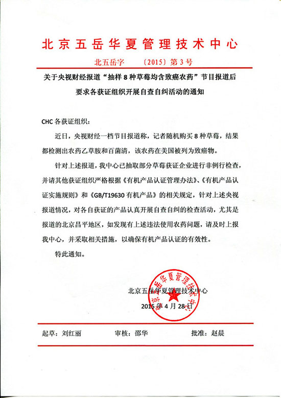 關于央視財經頻道報道“抽樣8種草莓均含致癌農藥”節(jié)目后報道后要求各獲證組織開展自查自糾活動的通知